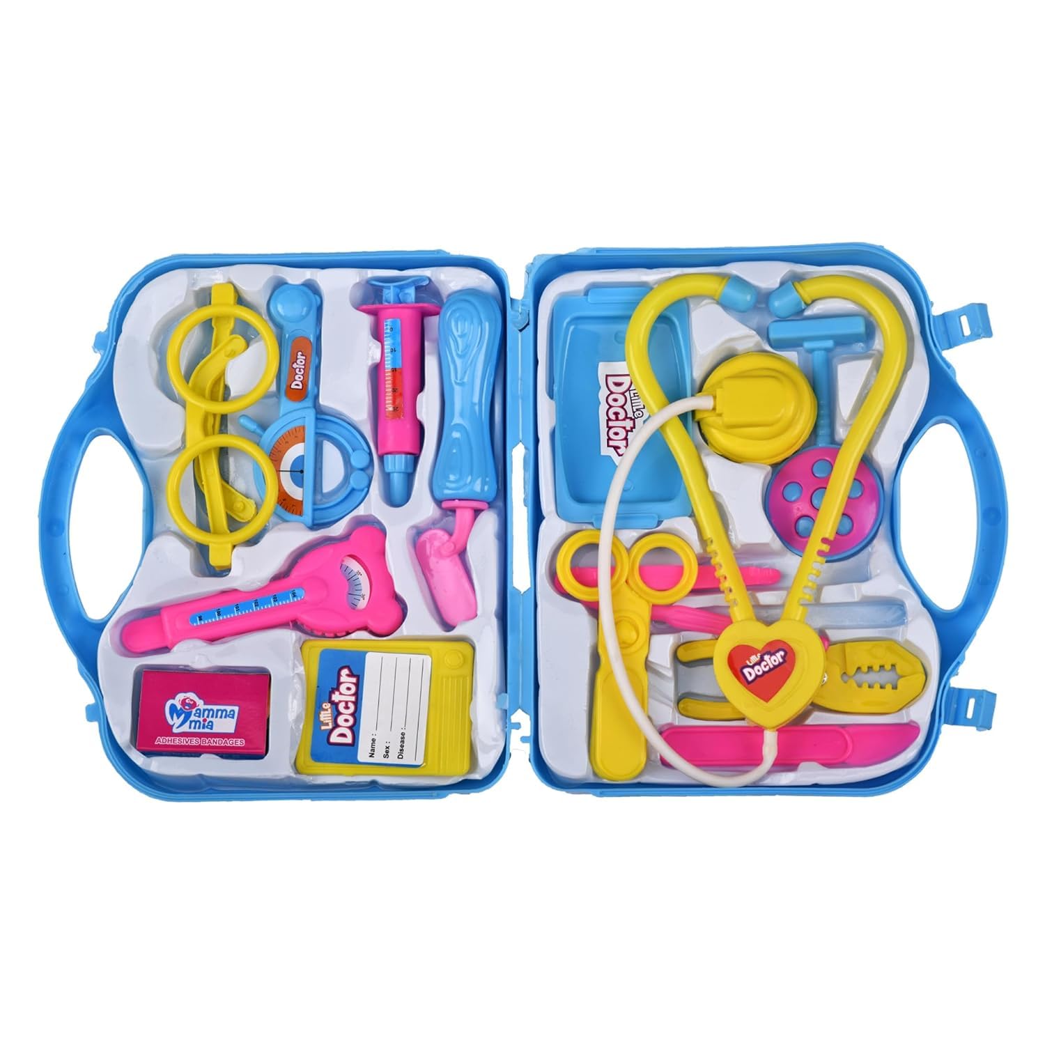 Doctor kit set includes Hard wearing plastic carry case, Stethoscope, Scissors, Reflex hammer, Thermometer, Tongue depressor and other accessories. Help kids know different kind of medical kit