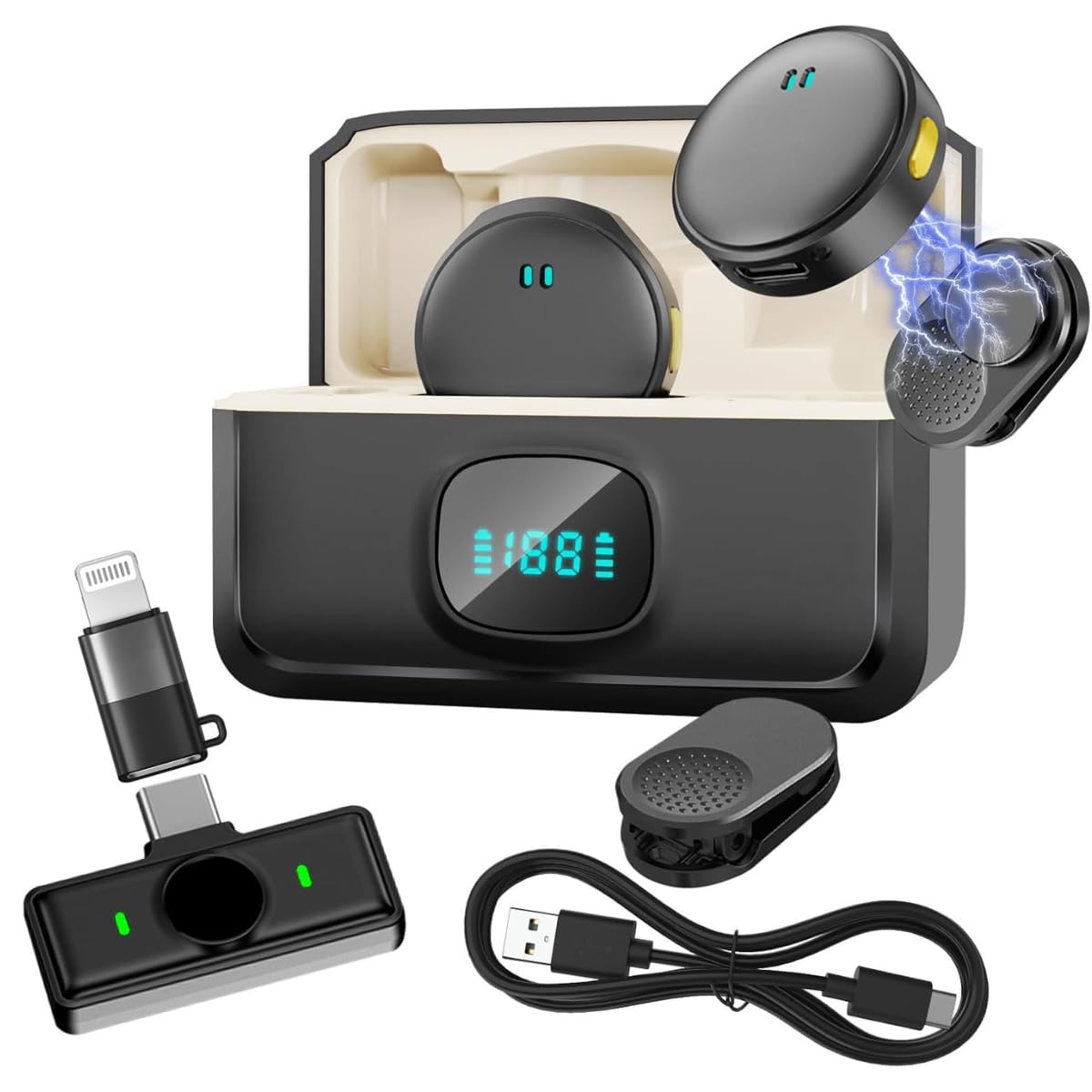 UNIVERSAL COMPATIBILITY: Comes with Type C and Lghtning connector, ensuring broad compatibility across iOS, Android devices, and DSLR cameras. Wireless Lavalier Microphone for iPhone15/iPad/Android, Wireless Microphone with USB-C, Noise Cancellation, Professional Recording Mic for Video, Live Streaming, YouTube, Instagram Reels & Vlogging.