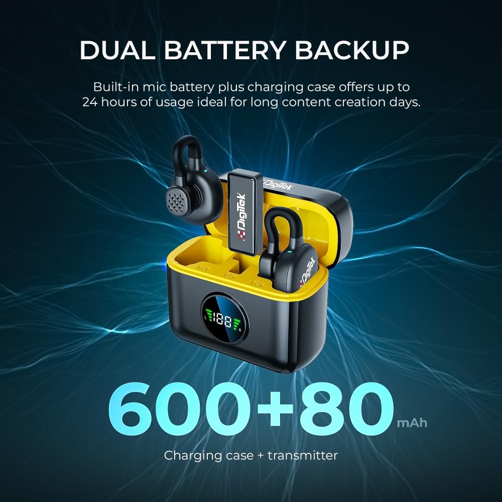 Power Indicator & Digital Display – Stay informed with built-in LED power indicators on the mic and digital display on the charging case, showing real-time battery status.
