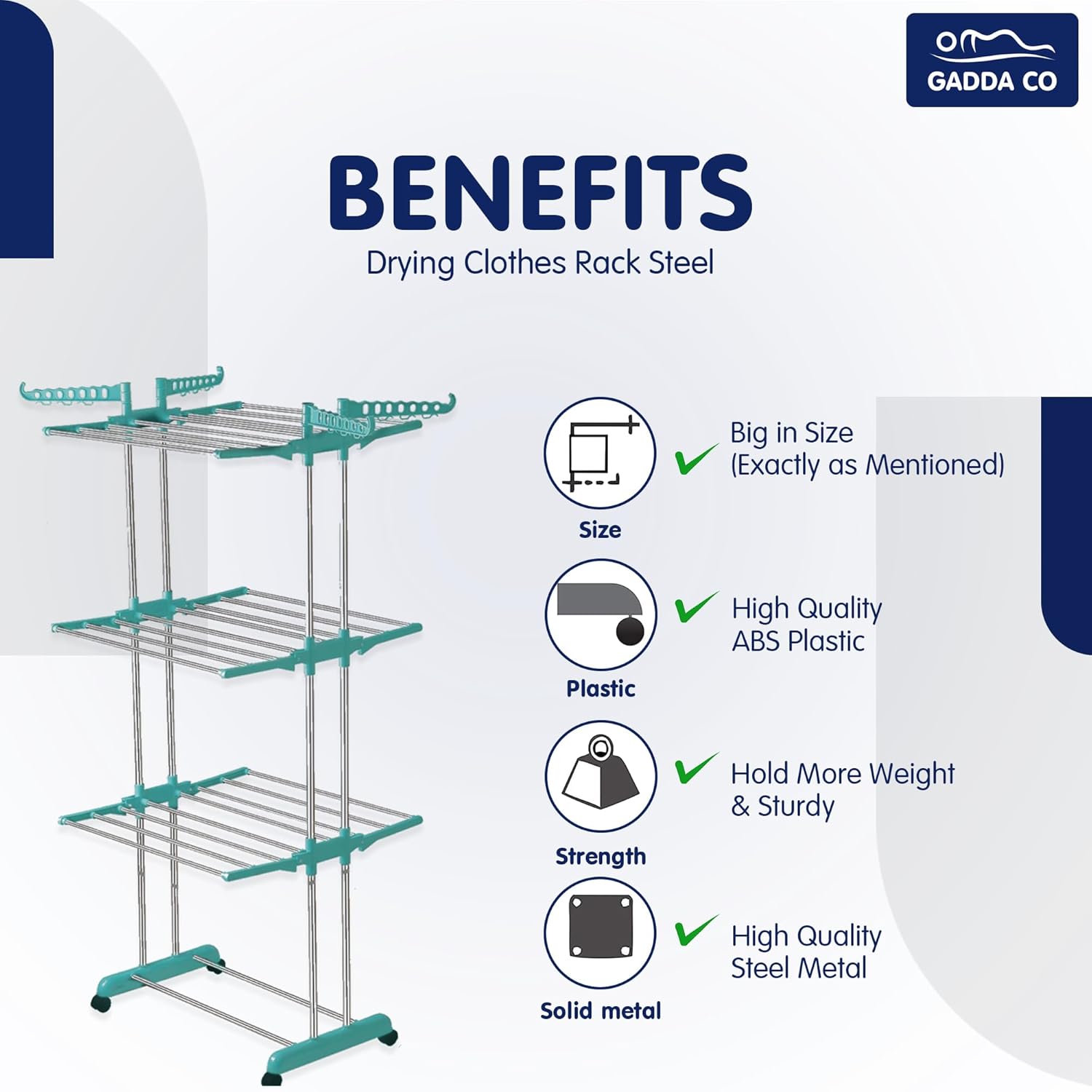 💪 Heavy Load Capacity – Up to 35 KG – Made with high-grade stainless steel pipes and virgin PPCP plastic for strength, durability, and rust resistance; easily holds heavy laundry like blankets, towels, and jeans without bending.