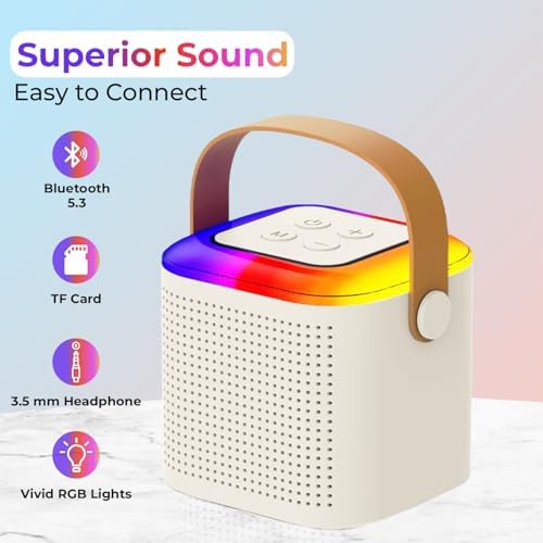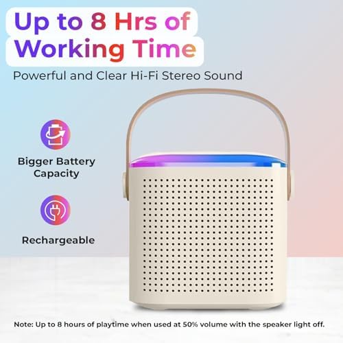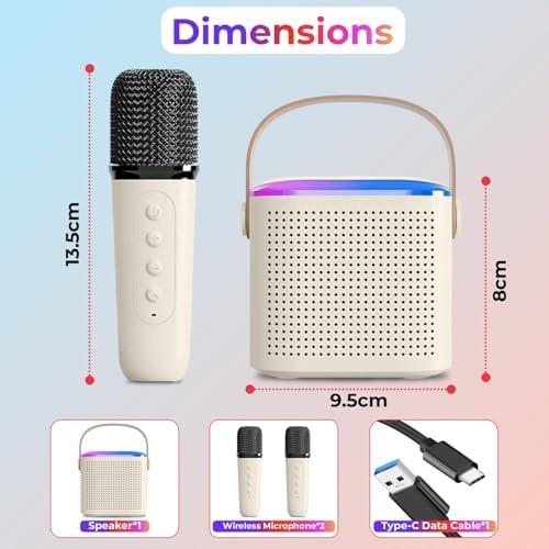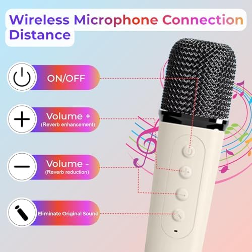 ✅ Extended Hours of Fun: Enjoy 8-10 hours of non-stop entertainment with the built-in rechargeable battery, two wireless microphones for solo or duet performances, and automatic Bluetooth connection with RGB lights.