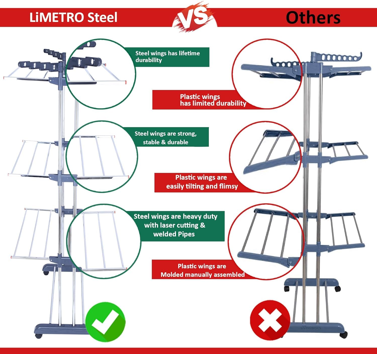 ✅Limetro Steel 3 Layer Strainless Steel Clothes Stand for Drying, Cloth Drying stand, Cloth Stand For Drying Clothes with Foldable Wings, Cloth Drying Stand for Balcony with Wheels