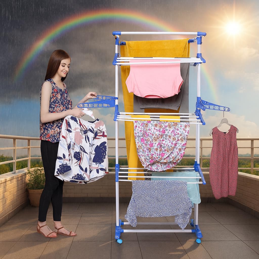 PARASNATH 3 Poll Steel Blue Colour Cloth Drying Stand Multiple Folding Arms, Castor Wheels with Brake, Special Epoxy Coated Pipes for Rust Resistance – 6 Year Manufacturer Warranty – Made in India