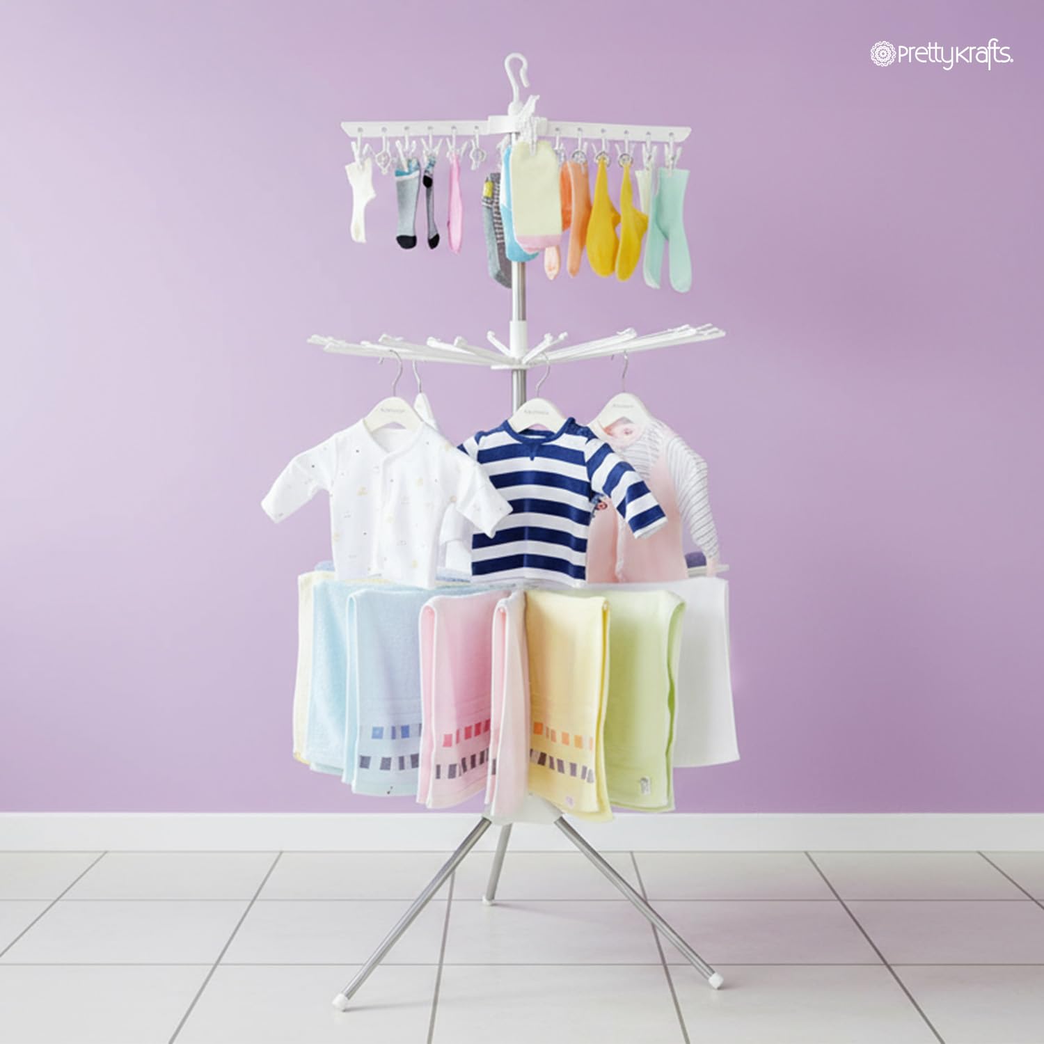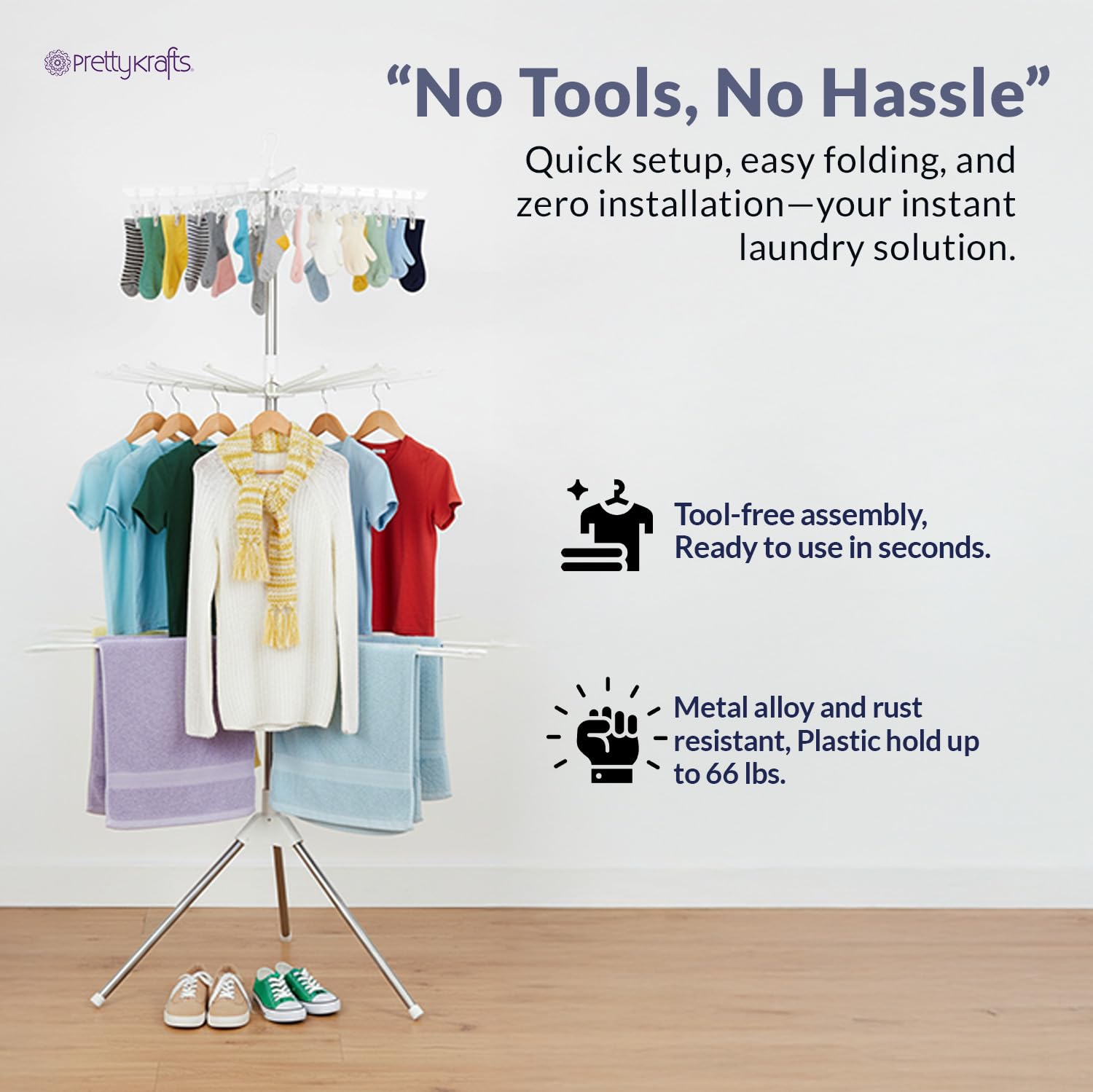 Sturdy& Durable: Our freestanding drying rack has 24 Clips and 32 Towels Bars drying rods that can hold up to 66lbs garments. You can expand the number of arms you need according to the space and usage needs. The unique tripod structure of the folding laundry rack can maintain perfect stability in a limited space. Our clothes drying racks are made of metal alloy and durable plastic, which are strong and rust-resistant. It is a durable and perfect laundry day companion.