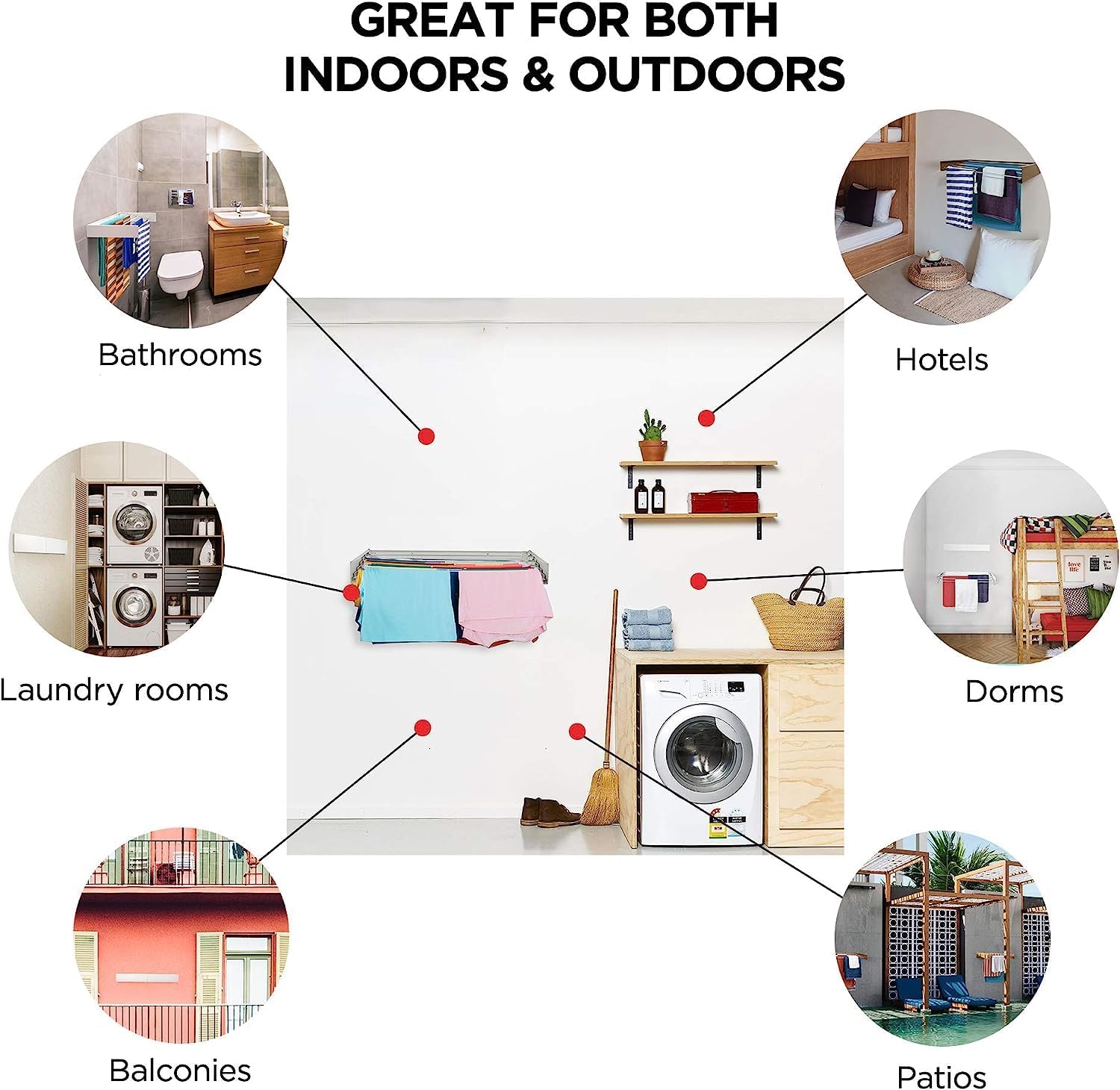 ✅ It is ideal for Indoor & Outdoor Use: because of its metal components. Great for laundry rooms, restrooms, garages, hotel, and dorm rooms, as a towel rack, retractable clothesline, towel hanger, etc.