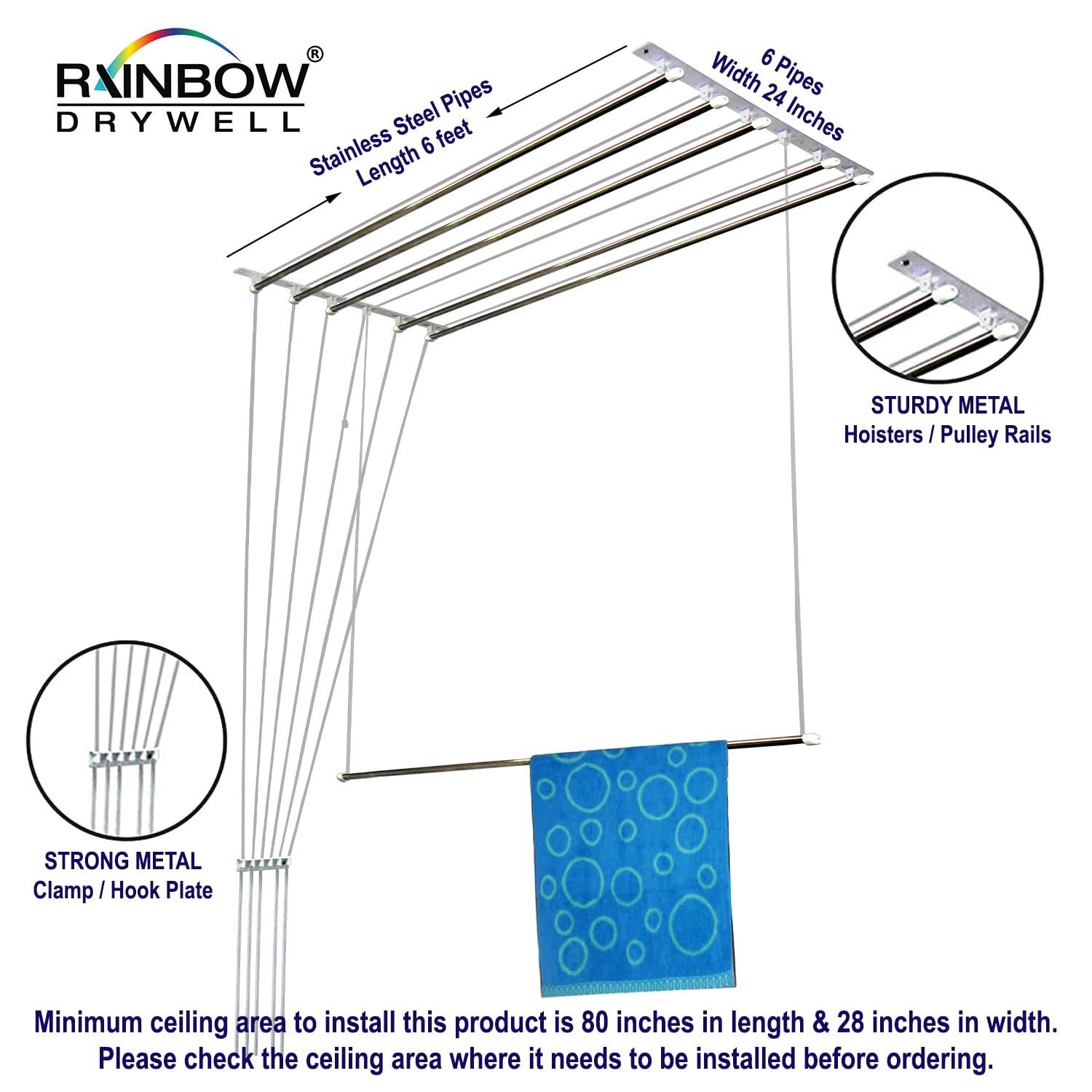 Rainbow Drywell Heavy Duty Stainless Steel Luxury(6 Pipes X 6 Feet) Protected Nylon Ropes Individual dropdown Ceiling Cloth Dryer/Cloth Hanger/Cloth Drying Stand for Balcony/Clothes Stand for Drying