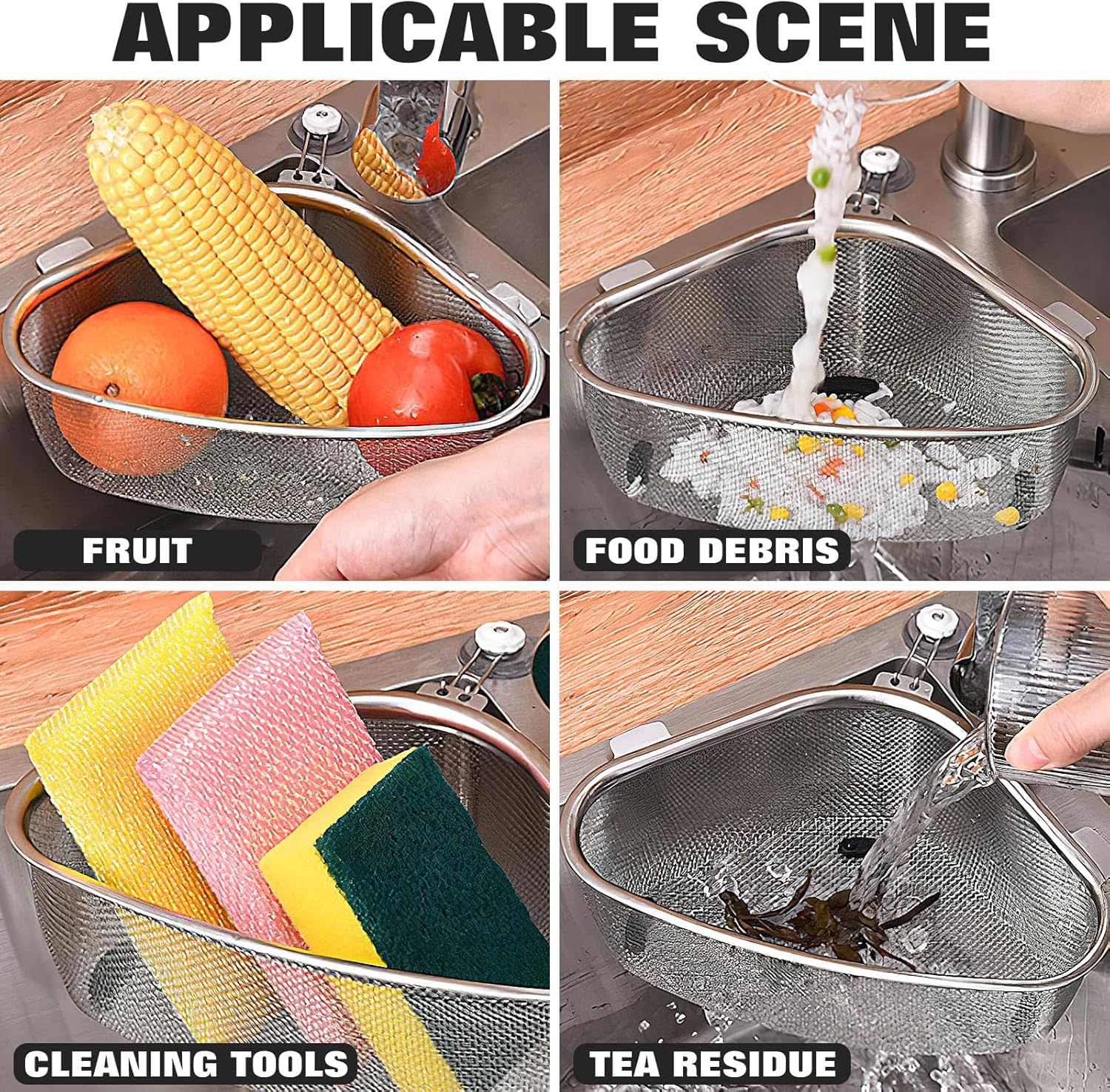 Easy to Install & Remove: No tools required; simply attach to the sink corner using suction cups or adhesive hooks (not included) for secure placement.