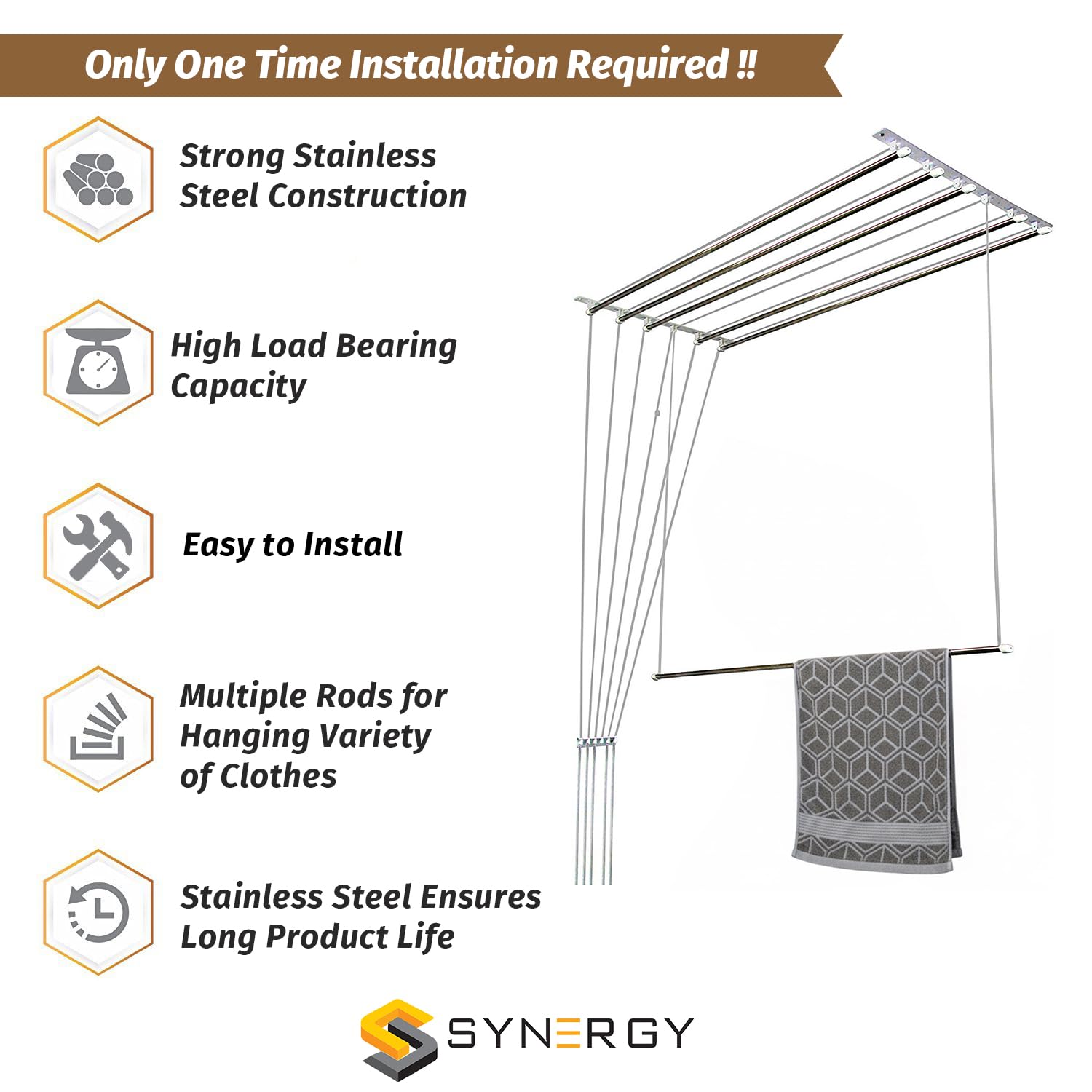 FEATURES 6 Sturdy Stainless Steel Rods. UV Protected Nylon Rope. Mounting Hardware Included. Takes Up Zero Floor Space. Useful for Drying Large Clothes like Sarees, Bedsheets, etc. Individual Drop-Down Railers Facilitates ease of use.