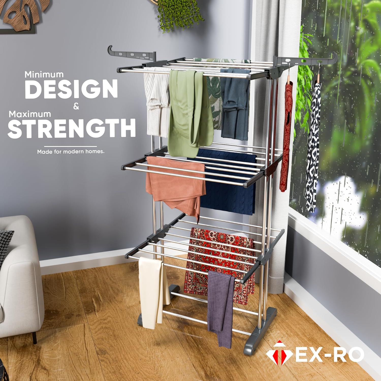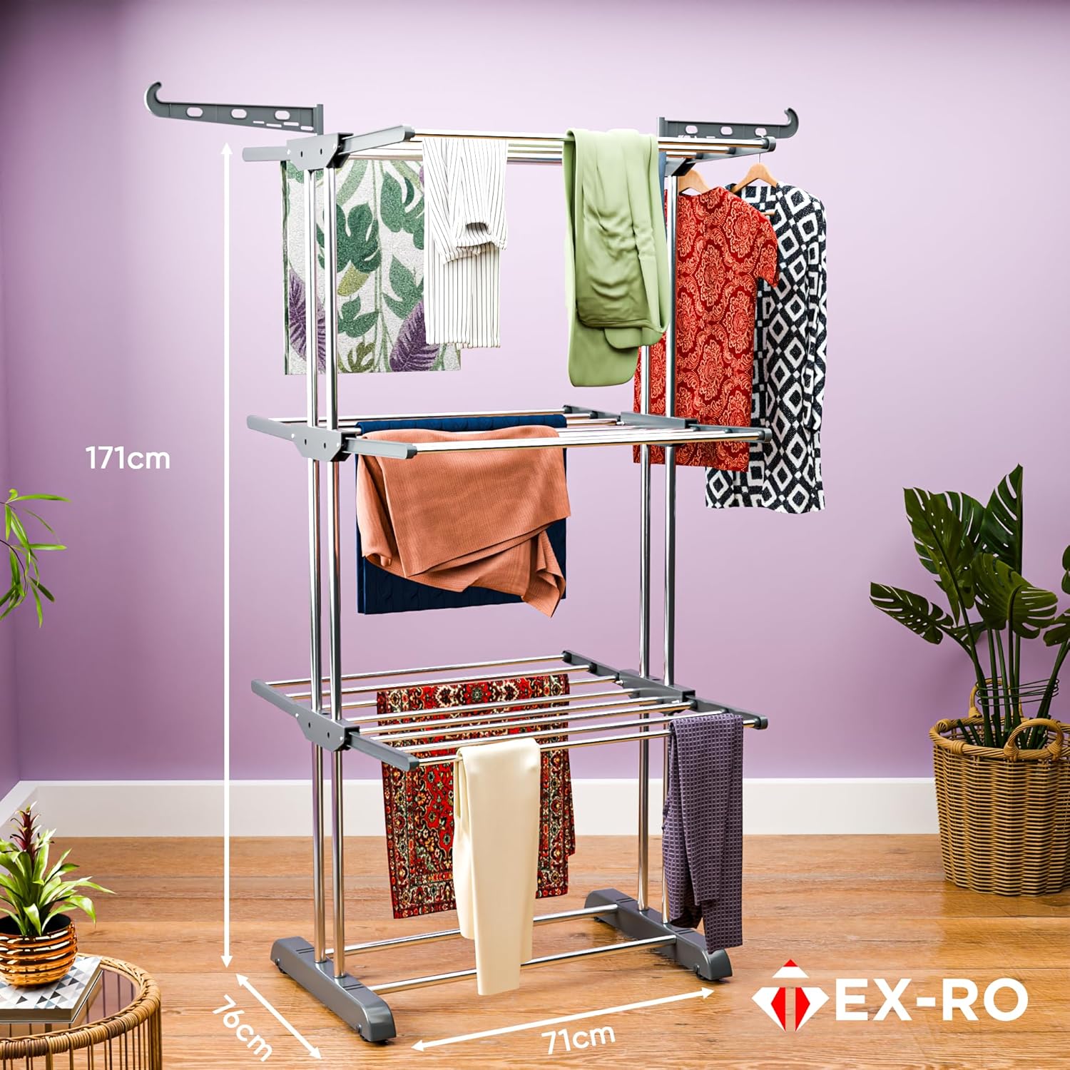 TEX-RO Clothes Drying Stand for Home/Cloth Dryer Stand/Cloth Stand for Drying Clothes Foldable/Stainless Steel Clothes Hanging Stand/Portable Cloth Rack for Balcony & Indoor (3 Layer, Grey)