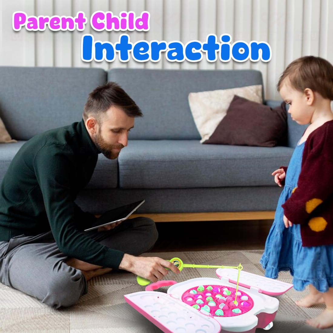 INTERACTIVE MUSIC & LIGHT EFFECTS: Featuring cheerful music and vibrant lighting, this toy creates an engaging atmosphere that enhances the fishing game experience, making playtime more immersive and entertaining.