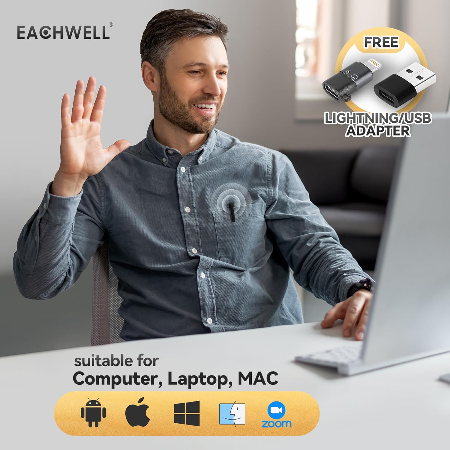AI Active Noise Reduction, Pure Voice Focus: EACHWELL wireless lapel microphone cuts background noise with smart filtering. Specialized vocal-capture technology delivers studio-grade voice clarity—engineered to preserve every natural tone of human speech.