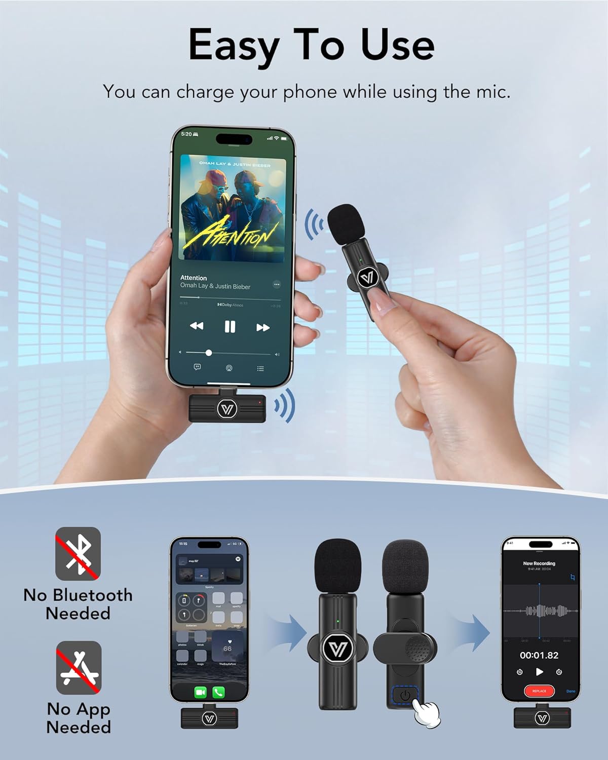 Plug & Play: No app or Bluetooth needed. Our advanced 2.4Ghz technology ensures a stable, low-latency connection, making this an ideal microphone for recording. With both Type-C and Lightning adapters included, it works with almost all Android smartphones, iPhones, and tablets.