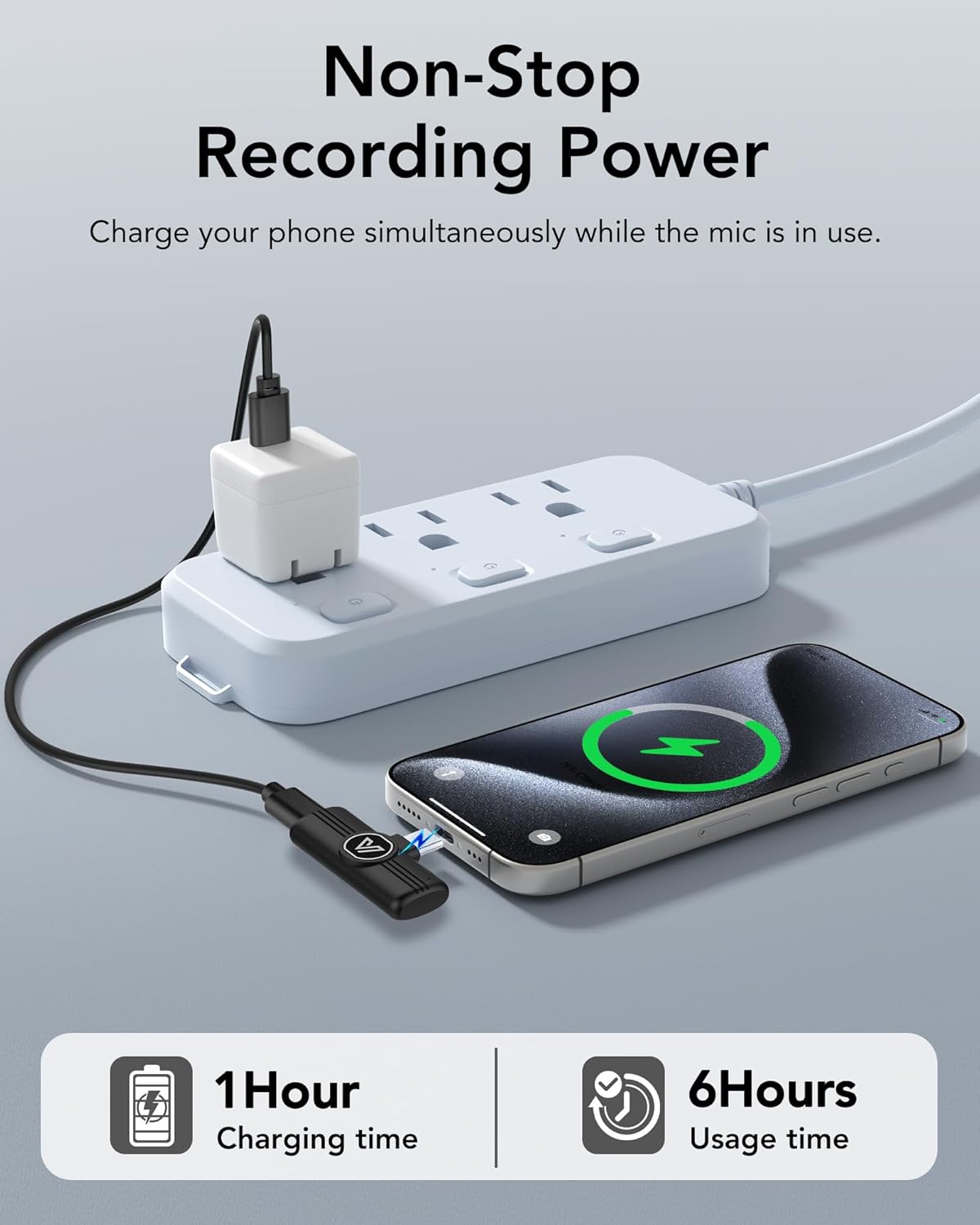 6-Hour Battery & Charge While Recording: Record for up to 6 hours on a single charge. The mic receiver features a Type-C port, allowing you to charge your phone simultaneously while the microphone is in use. This ensures uninterrupted power for long live streams or video shoots.